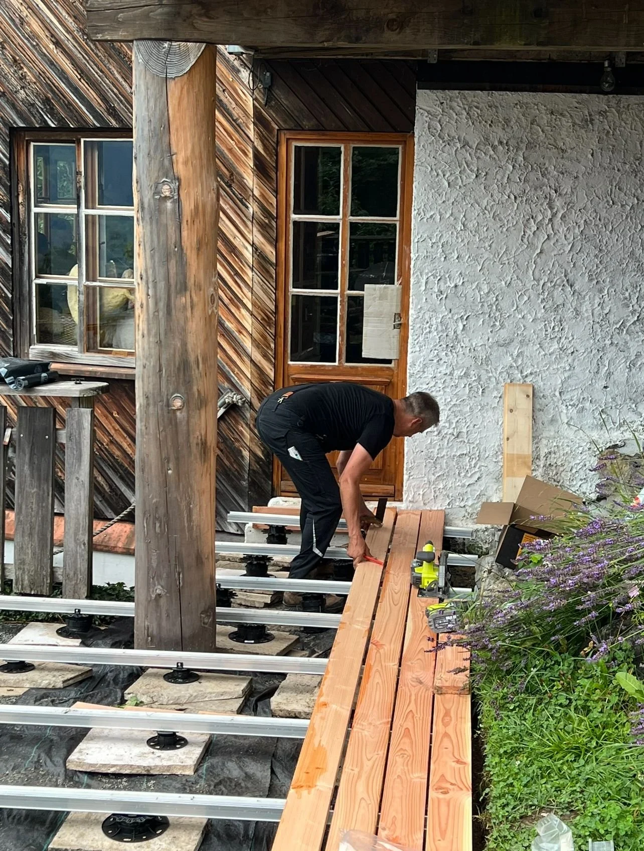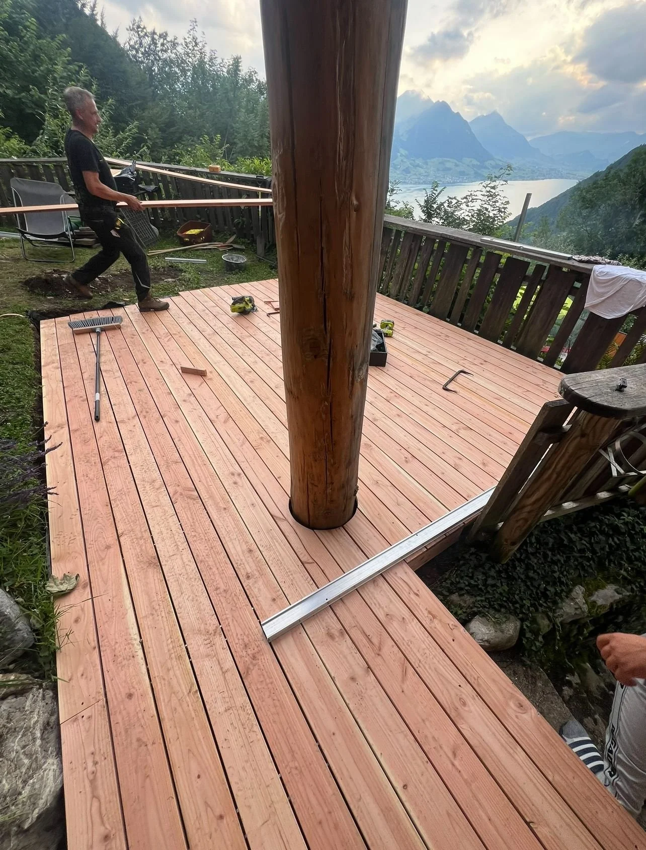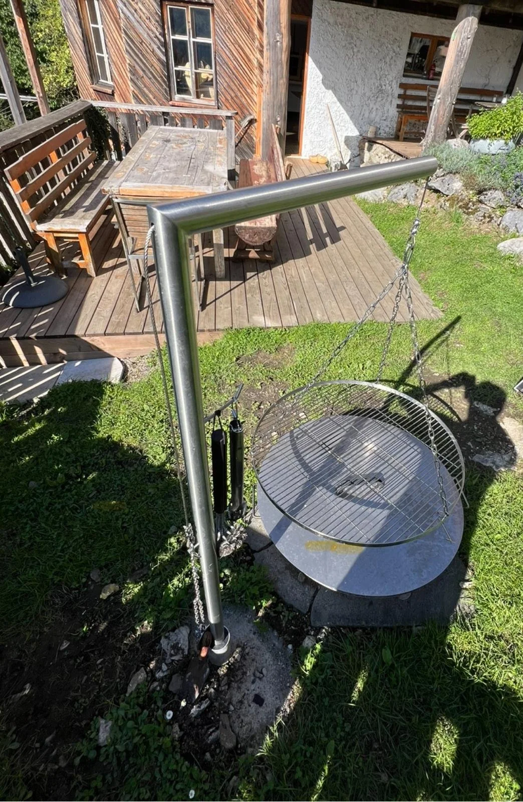 Vor dem Kücheneingang entstand eine neue Holzterrasse, die zum Verweilen einlädt. Zusätzlich wurde ein Edelstahl-Schwenkgrill über der Feuerschale eingebaut – ein idealer Ort für gemeinsames Kochen und gesellige Abende.